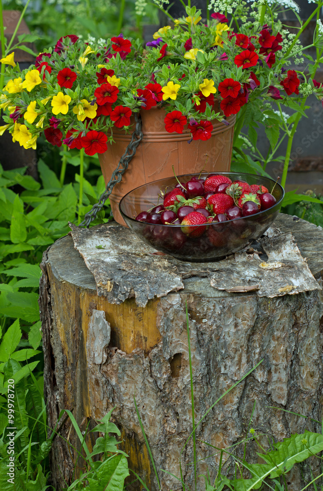 На деревянном пне стоит стеклянная тарелка с ягодами клубникой и вишней