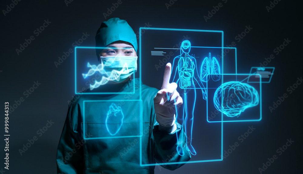 Asian female doctor specialist surgeon using computer human body anatomy display screen technology artificial intelligence assistance AI, operation simulation augmented reality medical healthcare tech