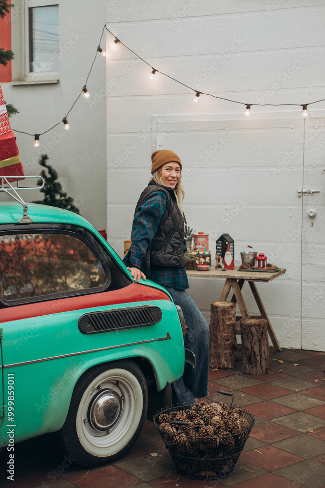 Young blonde woman near retro car with Christmas decorations
