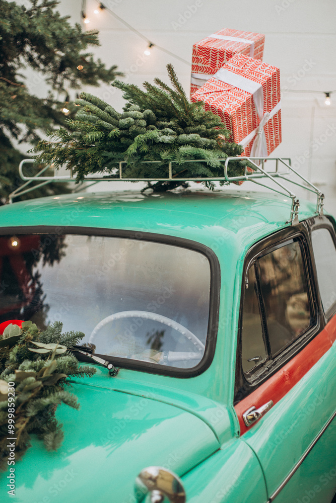 Retro mint colored car with christmas decorations